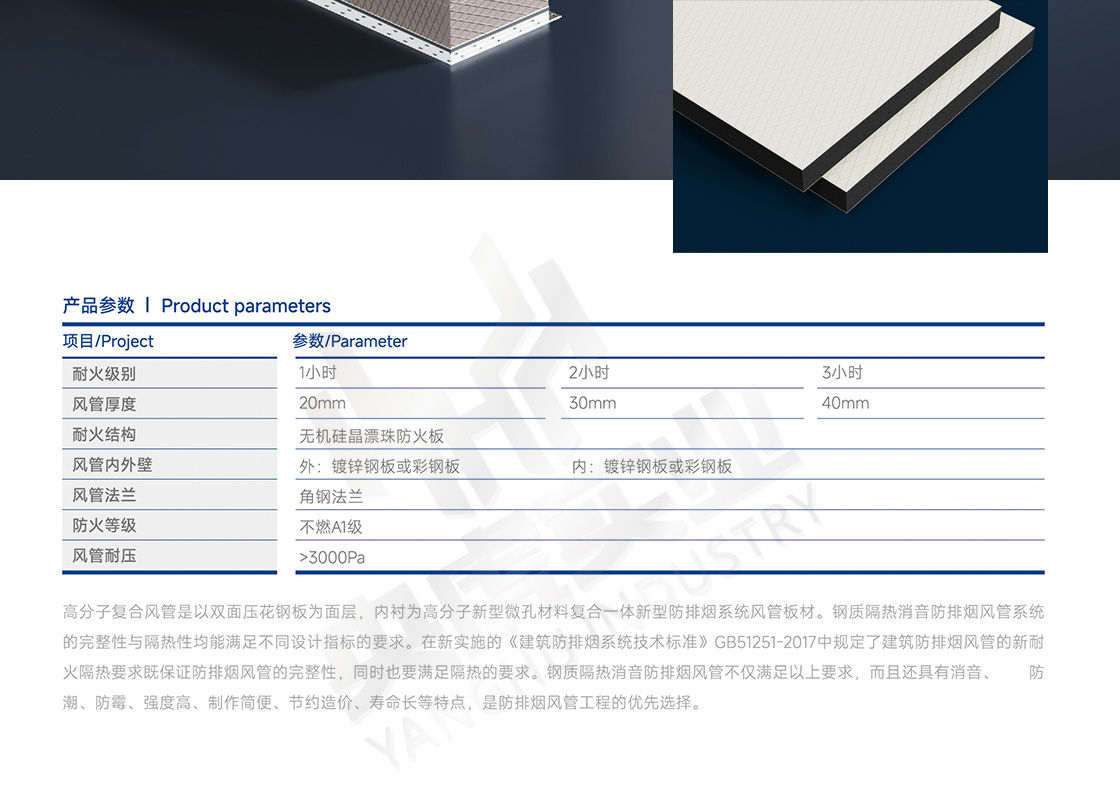高分子复合风管是以双面压花钢板为面层,内衬为高分子新型微孔材料复合一体新型防排烟系统风管板材。钢质隔热消音防排烟风管系统的完整性与隔热性均能满足不同设计指标的要求。 在新实施的《建筑防排烟系统技术标准》GB51251-2017中规定了建筑防排烟风管的新耐火隔热要求既保证防排烟风管的完整性,同时也要满足隔热的要求。钢质隔热消音防排烟风管不仅满足以上要求,而且还具有消音、 防潮、防霉、强度高、制作简便、节约造价、寿命长等特点,是防排烟风管工程的优先选择。