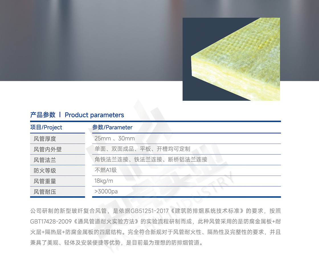 公司研制的新型玻纤复合风管,是依据 GB51251-2017《 建筑防排烟系统技术标准》的要求,按照 GB/T17428-2009《 通风管道耐火实验方法》的实验流程研制而成, 此种风管采用的是防腐金属板+保温层+防腐金属板的三层结构,兼具了美观、轻体及安装便捷等优势,是目前最为理想的空调管道。